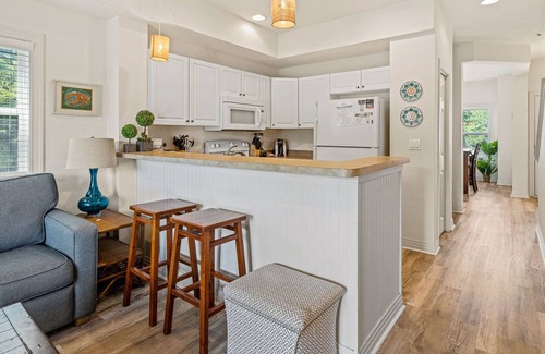 As you enter through the first level, you will find yourself in the intimate great room. Here is the living room outfitted with a sofa and flat screen TV. The efficient and well-equipped kitchen is perfect for creating quick meals or snacks. The breakfast bar with seating for two promotes great conversation. The formal dining area with seating for 6 beckons the whole group to sit down and break bread together. It's the perfect way to catch up on your great vacation experiences and make plans as a family!