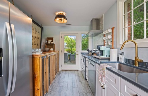 The kitchen is well-stocked with both a Keurig and a traditional drip coffee maker to satisfy every caffeine craving. You can enjoy meals in the adjacent dining area, where a table for five invites lingering conversations or outside on the patio at the table for six. The spacious backyard is made for gatherings between the comfortable seating and a patio grill—ideal for evening cookouts or lazy afternoon lounging. Whether you're strolling tree-lined streets, enjoying live music, or simply soaking up small-town charm from your private yard, Corner Cottage offers the perfect blend of comfort, character, and location.