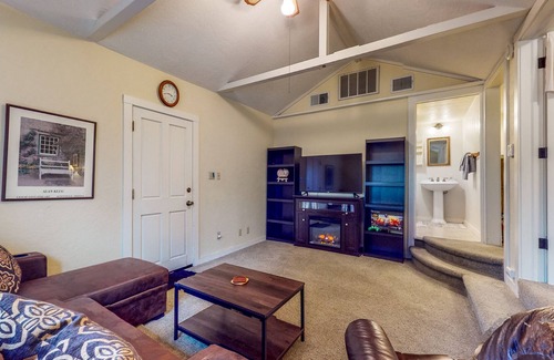 Inside, a welcoming open floor plan offers thoughtful and convenient touches like an electric fireplace TV stand, video games, a queen sofa bed for additional sleeping space, and a full-sized kitchen (dishwasher not included). You and your guests will also have access to the on-site washer/dryer.