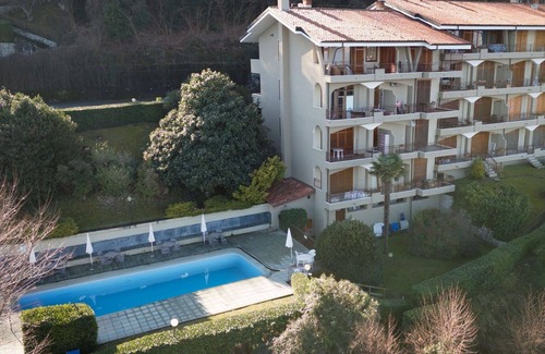 Lake Stresa Apartment: Located in an elevated position on a slope in Stresa, Italy, this 4-story apartment block offers a shared swimming pool (12 x 6 m, seasonal availability: 01.Jun. - 15.Sep.), outdoor shower, and is within 2.5 km of the town center. Just 2 km from the lake and beach, this vacation rental provides amenities like Internet Wifi, Parking, and a Yard, making it an ideal choice for your holiday rental in the area.