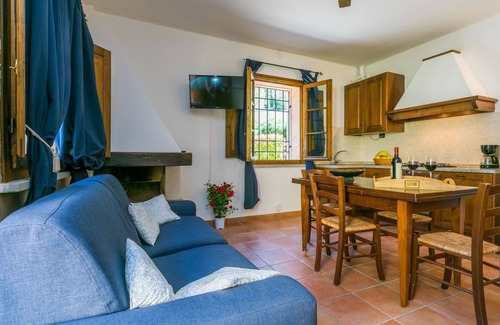 Casolare Bretulla is a charming 2-room apartment covering an area of 45 square meters. It is situated on the ground floor and underwent renovations in 2017. The apartment features rustic and cosy furnishings that create a warm and inviting atmosphere. The living/sleeping room is furnished with a double sofa bed, open-hearth fireplace, dining table, and a satellite TV (flat screen). It also has a double bedroom and an open kitchen. The bathroom is equipped with a shower/bidet/WC. The apartment has natural stone floors and a lovely patio that is roofed.