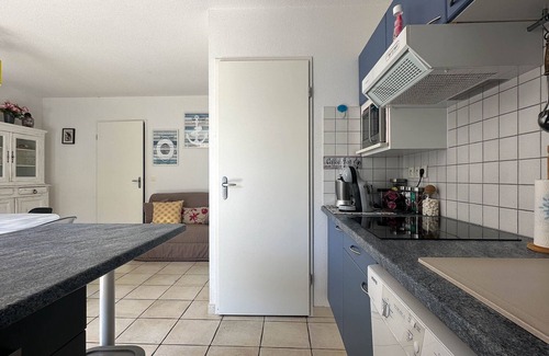 Single-story 2-room semi-detached house, southwest-facing - Sleeps 4 - Living area approximately 40 m² - Living room with 140cm sofa bed and TV, opening onto a terrace with awning - Equipped open-plan kitchen: Extractor hood, 4 induction hobs, microwave, dishwasher, oven - Pantry with washing machine and fridge-freezer - Bedroom with 1 140cm bed, wardrobe - Shower room - separate toilet - Travel cot with mattress
