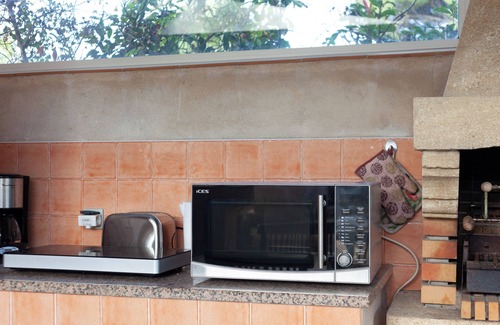 The private outdoor space invites relaxation with an open-air terrace and a barbecue for enjoying meals outside. You can also take advantage of the shared space, which includes a well-maintained garden, a playground for children, and a fully equipped summer kitchen for cooking in a convivial setting.