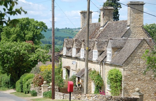 It is a five-minute walk to a traditional English pub with excellent food. Rolling Cotswold countryside can be seen past the traditional village rooflines at the back.