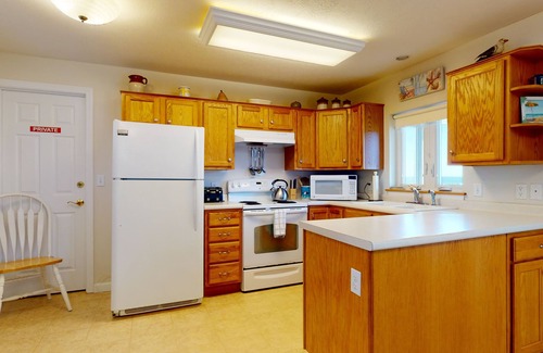 Cottage by the Sea #3. features a kitchen, dining, living areas, and a bathroom with washer/dry on the first floor and upstairs, a queen bedroom with ocean views and attached bath awaits, along with a twin bedroom and a third