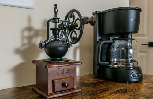 Kitchen that comes fully stocked with two coffee makers and everything you need to enjoy a meal.