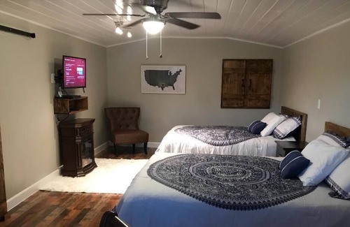 There are two queen beds, bathroom, tub and shower. The ceilings are a little low, if you are over 6'2". Set in between Six Flags, Sea World and downtown San Antonio. It has a beautiful shared courtyard and pool with three homes on the property. Close to Lackland Air Force Base, free wifi, tv by pool area under beautiful pavilion. Additional bathroom and shower by the pool. Very quiet environment. Check in is at 3:00 p.m. and check out is at 11:00 a.m.