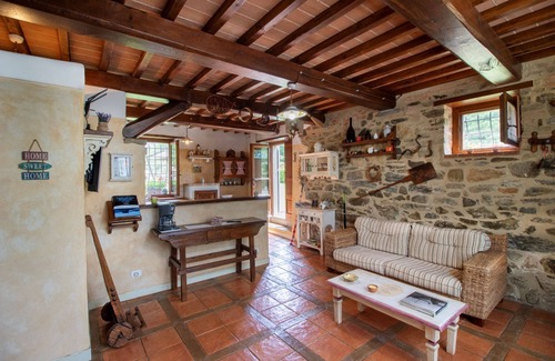 In the heart of the Val di Chio. In the heart of the Val di Chio, on the border between Tuscany and Umbria and only a few km far from the village of Castiglion Fiorentino, we find the lovely CASA DI PINO, small and ancient stone cottage dated back to the year 1200, like the beautiful 'Maestà' a painted Madonna with child which you can admire in the nearby grove inside the property. At the edge of the property a green wood, ideal to have enchanting walks during the hot summer days. The garden, swimming pool and all house services. In the wide garden in front of the house there are a beautiful swimming pool (size m. 4x8 - depth m. 1,20-1,50 - open from 01st May to 30th September) with Jacuzzi, the barbecue and a gazebo equipped with table and chairs ideal to eat 'al fresco' admiring the high hills which crown the surrounding landscape. Castiglion Fiorentino is only 7 km far and offers shops, restaurants and all kind of services. A few metres far from the house a panoramic secondary road which crosses the hills and joins Castiglion Fiorentino to the town of Cortona and to the nearby Umbria region. Good quality and comfortable furniture in tone with the style of the house, which is endowed with air conditioning and satellite television. The property accepts small size pets.