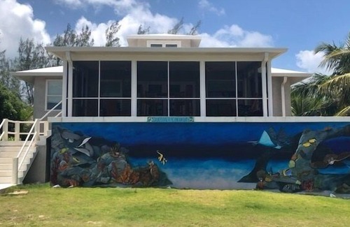 Cotton & Coconuts is a 3 bedroom 2 1/2 bath home located on Lookout Road in Rainbow Bay. The view looks out over the Atlantic Ocean. The house is a 2-minute walk to Come N Go Beach. Steps leading up to a screened lanai invite you to the front entrance.