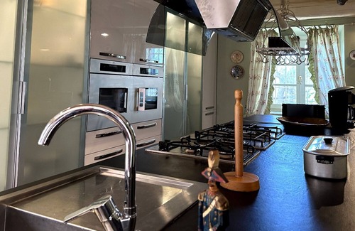 Entrance on the ground floor within a few steps into a spacious kitchen, which is top modern and very nice, stove with 5 rings in the middle, 2 electric ovens, fridge/freezer, italian moka and American coffee machine, dishwasher, nice dining room with round table, ante room to a bathroom with antique stone basin, 1 bathroom with shower, wc, bidet.