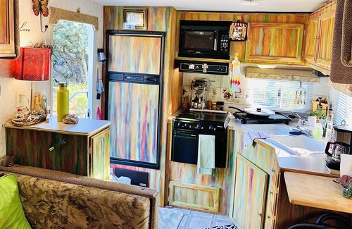 This cozy RV is located on the top of a mountain on 8 acres. Breathtaking sunsets/360 views! You can see many stars at night which makes it great for stargazing. Glamp next to 2 beautiful horses, an array of beautiful wildflowers, and native plants.