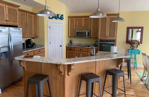 This 3 bedroom, 2 bath home is located on Cowan Creek at Weiss Lake in Northeast Alabama. The fully furnished home features spectacular views of the lake and surrounding mountains. Cowan Creek is a favorite location for wake boarding, kayaking, paddle boarding, water skiing, and fishing. The master bedroom is furnished with a queen size bed. There are twin beds in each of the other two bedrooms. And, there are twin beds in the loft. The great room also has a sleeper sofa. Towels and linens are provided. The kitchen is fully furnished and there is a washer/dryer in the laundry room. The home also has internet access (wifi), high-definition satellite TV and DVD player. There is a parking pad for a boat trailer or small RV and adequate parking for two additional vehicles in the driveway (garage is used for owner storage and is not accessible). The home has two exterior security cameras and one interior camera (which can be turned off for privacy).. The deck has adirondack chairs, and table with chairs. A gas grill is also available. There is a concrete walk down to the dock which has a power outlet for boat charges or other equipment and a fish cleaning station (the dock does not have lights). There are chairs on the dock. Located on a natural point, the dock is a great area for swimming, with a ladder provided. In addition to the deck off the back of the house, there is a sitting area closer to the lake with a pergola and incredible views of the lake and surrounding mountains. Boats can be launched nearby at Cowan Creek Resort or Roosters; both are less than one mile away. There are many scenic areas and trails nearby, most notably Little River Canyon National Preserve and Cherokee Rock Village. Canoe and kayak trips on Terrapin Creek is also a popular nearby outing. There are two nesting pairs of Bald Eagles on Cowan Creek; Herons and Egrets are common sightings along with other water fowl. Migrating pelicans can be seen on the lake from late October into January.