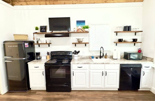 This tiny cabin is a two bedroom and 1 bath. Downstairs you have a spacious living room and kitchen that includes everything you would need for a comfy stay. Couch does fold out to sleep one adult. There is a bar table to eat or do your computer work at. The kitchen has a refrigerator, stove, microwave, drip style coffee maker and all the essentials needed to eat, cook and drink. The downstairs bedroom includes a queen-size bed and cubical dresser. The upstairs bedroom is accessed by climbing the rustic ladder where you'll find two full-size beds. The bathroom is downstairs and is very roomy. It has a walk-in shower, toilet and vanity. The bathroom does come with a set of toiletries for your trip which includes; shampoo, conditioner, body wash, and lotion.
