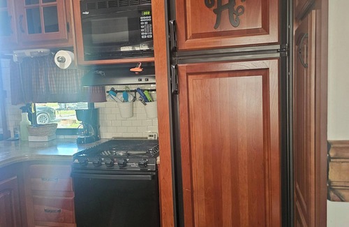 * Kitchen: stove with oven, refrigerator, microwave, pantry and coffee maker, toaster