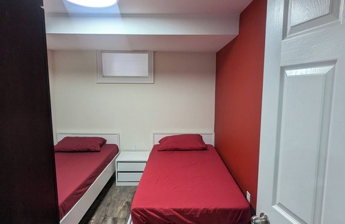 Get ready to relax in this 2-bedroom apartment in Brampton. This beautiful space features 1 queen bed and 1 full bed, perfect for a small group of guests. Enjoy the convenience of amenities like AC, WiFi, and a washing machine. The bathroom is equipped with a hair dryer and bidet for added comfort. We look forward to welcoming you to our place.