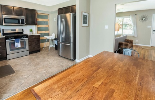 Enjoy a family friendly backyard getaway in a remodeled 1950s 3 bed/2 bath ranch in a quiet neighborhood on the east side of Bloomington, just 2 miles from campus. Relax inside the bright living room, in the fenced-in backyard, or under the large cozy covered back deck while enjoying our coffee and tea cabinet. Our home is minutes to the new hospital, college mall shopping/eating, downtown, and local wineries. We are 8.2 miles to Lake Monroe (Paynetown), 8.4 miles to Lake Lemon, 17 miles to Nashville, IN/Brown County. We have a long driveway that can fit about 4 cars including boats. We accept pets! Fees are $25 per pet, per night charged separately from booking (day after check in). If you are staying longer than 7 nights or have multiple pets, we cap this fee at $175. We know your pet is great! However, it is in our experience pets can get anxious in a new place when you leave. It's our rule they must be in a cage or kennel when you leave for the day, for any amount of time. This is a one level ranch, however there is one step at the front door to enter. The 3 bedrooms include: Room 1) a queen bed, Room 2) a queen bed, and Room 3) a queen bed with a desk and chair for working. We know guests have different preferences for mattress comfort, so we have medium firm mattresses for a broad range of appeal for all of our guest's body types, sleep positions, and comfort preferences. We have blackout curtains in all our bedrooms. There are 2 full baths: one with a bathtub and the other is a walk in shower attached to the master bedroom. Enjoy your time in Bloomington at our cozy house!
