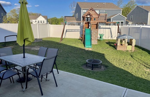 With a fenced in backyard, large playset, fire pit, patio, outdoor dining area, and relaxing front porch, this home is fun for all ages. The easily expandable kitchen table allows for large groups to gather and enjoy time together.