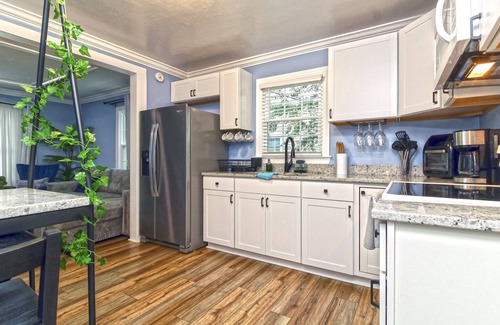 ✨Completely renovated & beautifully decorated open-concept home with luxury mattresses, 70in 4K TV, private patio, FENCED backyard w/ multiple swing chairs, comfortable outdoor seating, grill & fireplace!