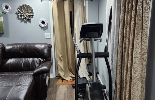 The tucked-away basement studio has a living room with a leather reclining sectional and flat-screen TV. The bedroom boasts a king-sized bed (sleeps 2) and the bathroom has a walk-in rain shower with body sprays. There is parking on the street or on the side of the house, where you will follow the path in the back to a separate basement door to enter your home away from home. Wifi is included.