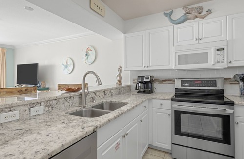 The AMAZING view of the ocean makes this the perfect place to relax and unwind at the beach! While you take a break from the sand, watch for dolphins from the 5th level balcony! Or take a dip in the beachfront seasonally heated community pool or get refreshed in the community hot tub. With a comfy king size bed in the bedroom, twin hall bunks, and a queen sofa bed in the living room, this condo is perfect for 4 guests. The kitchen has granite countertops, stainless steel appliances, and has all the kitchenware needed to prepare meals and dine in. Cute dining area next to the kitchen!
