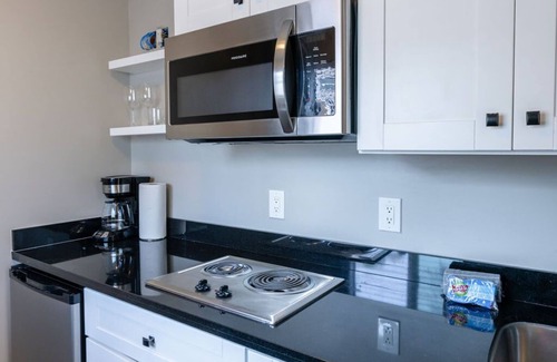 Step into this inviting studio that features a comfortable queen bed, a ceiling fan and A/C to keep you cool on summer nights, and a flat-screen, Smart TV for your entertainment. Whip up quick and simple meals in the kitchenette, complete with a mini refrigerator, 2-burner stove, microwave, coffee maker, plus high-top table for two. Freshen up in the combo tub/shower after a day at the beach or exploring the nearby attractions. Right outside your door, you'll discover a small patio area with a bistro table with 2 chairs. Enjoy your morning coffee or evening drinks in this outdoor space. Don't forget to fire up the BBQ and sizzle some steaks or seafood. There's no need to overpack! We provide a stacked washer and dryer on-site for your convenience. Discover the beauty of our coastal paradise, where you can unwind, soak up the sun, and create lasting memories. Whether you're seeking a romantic escape or a solo retreat, this cozy studio is your ideal home away from home.