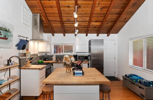 The well-appointed kitchen has everything you need to prepare a delicious meal, featuring stainless steel appliances, including a gas range/oven, fridge/freezer, microwave, and dishwasher. A standard coffee maker is provided for your morning brew, and the kitchen island offers additional seating for casual dining.
