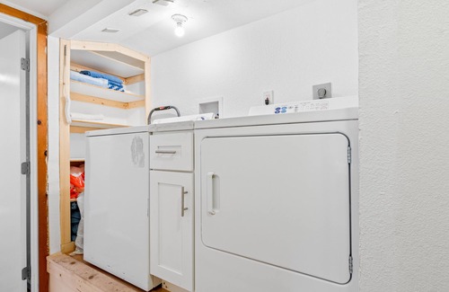 This cozy cabin includes a spacious open living area, where your entire family can relax, cook, eat, and play games all in the same space. The kitchen comes equipped with ample meal prep space and all the supplies needed to prepare meals for the whole crew. There is a small front porch to enjoy your morning coffee with filtered golf course views, and a back patio that is great for an al fresco meal. The main level bathroom includes a large soaking tub, perfect for relaxing after a long day spent outdoors. There is another bathroom on the lower level, paired with two bedrooms and private washer and dryer. The loft above the main level is a great choice for the kids, with an additional TV, video games, and multiple beds so there is room for everyone.