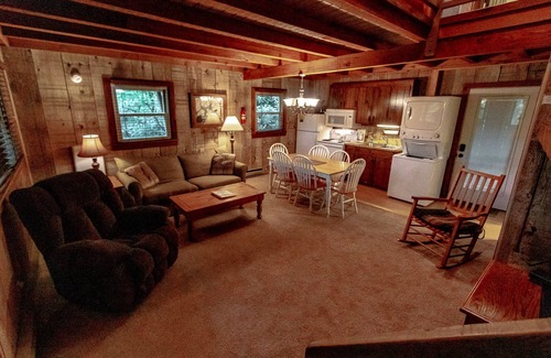 Tucked up in the woods at the top of our property, enjoy this rustic and cozy two level cabin. There are wooden stairs from the parking area as this is a top floor unit. Queen bedroom, two twin beds in a loft area, and full bath on upper level. Pull-out sofa bed and half-bath on lower level along with a full kitchen, washer/dryer combo, and a gas log fireplace. Covered seating area with rocking chairs are right outside your door to enjoy the mountain air. Pictures may not reflect the specific unit booked, but will be similar. First night's rent + fees will be charged at booking. This charge is refunded upon 24 hours notice, but forfeited in the case of a no call / no show.