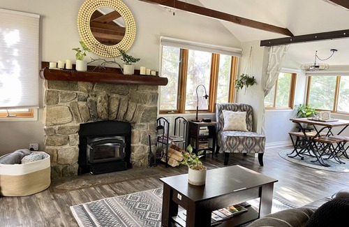 Come enjoy this unique 30's cabin that has been transformed into a rustic-modern, get away. Bask in the coziness as you enter through the foyer, and into the open living area, w/ vaulted, open beamed ceilings, original rock fireplace + alcove bedroom area. Off the living room, enter a cozy breakfast nook and updated kitchen with new appliances.