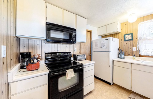 This cozy home is surrounded by towering trees, offering guests a tranquil place to land in between all their adventures. The living area boasts a wood stove and comfy seating while the dining area offers plenty of seating for savoring home-cooked meals prepared in the full kitchen.