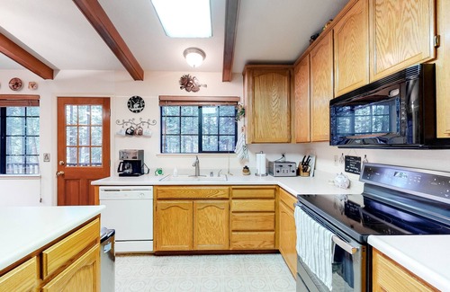 No matter what time of year you're looking for an escape filled with outdoor adventure, this cozy cabin in a peaceful wooded area is the perfect fit. Enjoy chit-chat and cocktails while you bask in the glow of the wood stove, or stretch out in the adjacent living area and watch your favorite TV shows. Provided books, puzzles, and board games offer added entertainment. The chef in your group will appreciate the well-equipped kitchen. When it's time to eat, gather at the dining table.
