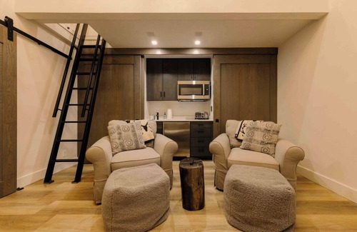This home hosts up to 6 guests, with three bedrooms and three bathrooms, as well as two lofted sleeping spaces, offering a comfortable place for everyone to rest their heads. The secluded main suite features a full bed, a private balcony, its own living space with a bar, tv, and gas fireplace, as well as a gorgeous ensuite with a double vanity and soaking tub. Above the kitchenette and living space is a lofted sleeping area suitable for one. The first guest bedroom includes a full bed and beautiful ensuite with clean, modern finishes. The room is decorated with ambient light fixtures and warm wood details. The second guest bedroom can be found in the loft and den area, located off of the main living space. The den is a dual space, functioning as a lounge area or a bedroom. It has a pull-out queen sofa bed, and provides direct access to the private patio. From this space, you can also reach the second lofted sleeping area where a twin bed lives, alongside a cubby to store some belongings.
