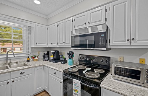 The kitchen table seats 6 adults comfortably. The kitchen itself is fully stocked with all the utensils and appliances needed to prepare home-cooked meals. We provide Keurig and drip coffee makers, coffee, creamer, and sweeteners. A full laundry closet is located in the kitchen as well.