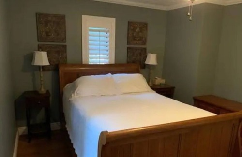 Home is a cozy cottage with plank ceilings in the bedrooms, painted paneled walls, large stone gas fireplace and an eclectic relaxing style.
