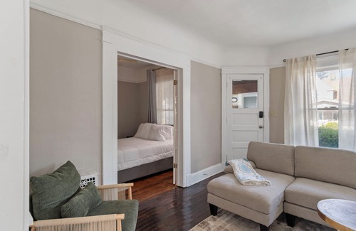 The space includes 2 bedrooms (1 king, 1 queen), 1 full bath, a fully stocked kitchen, comfy living room with 50” Smart TV, and an enclosed front porch for morning coffee. Guests have full access to the entire lower-level unit. The porch is shared entry for both units, and the backyard and basement (with washer/dryer) are shared with the upstairs tenant.