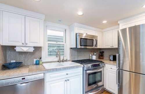 Inside, the owners have made creative and efficient use of the space, with a triple bunk greeting you as you walk through the front door. The hallway leads into the main living space, where you'll find hardwood floors, a delightfully modern kitchen with stainless steel appliances, and an inviting living room with a flatscreen TV. You can slide open the glass doors to the deck to take a seat in an Adirondack chair, get the grill going for dinner, take a dip in the private hot tub, or gather with loved ones around the firepit with a view of the mountains. Additional amenities include a washer/dryer, a flatscreen TV in each of the bedrooms, and free WiFi throughout the house.