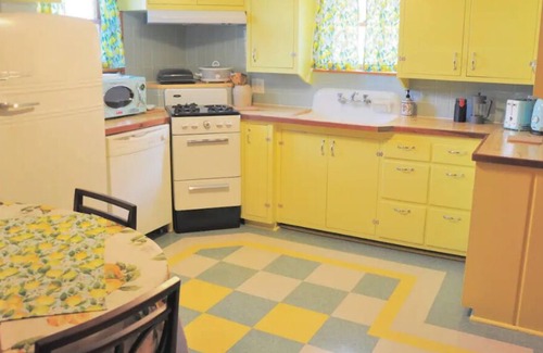 The living room has original wood paneling and a cozy vibe. The couch is perfect to stretch out and watch a movie on the Roku Tv or you can have fun with the board games and puzzles provided. Our antique desk is a great workspace with all the basics and plenty of plug-ins. The Wifi works well from anywhere in the apartment and much of the yard if you want to take those emails outdoors.
