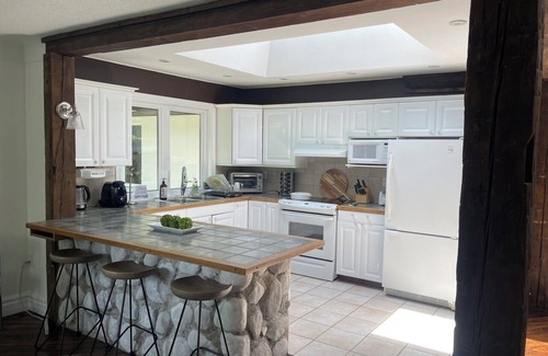 Private 3 Bedroom Home with serene cottage charm, this picturesque 4-season getaway invites you to unwind mere steps away from Lake Ontario & Paletta Mansion Historical Estate. Perfect for family retreats or group gatherings, our tranquil haven sleeps six in comfort. With a full-service kitchen, cozy gas fireplace, and outdoor living space complete with BBQ, every moment here is a cherished memory in the making.