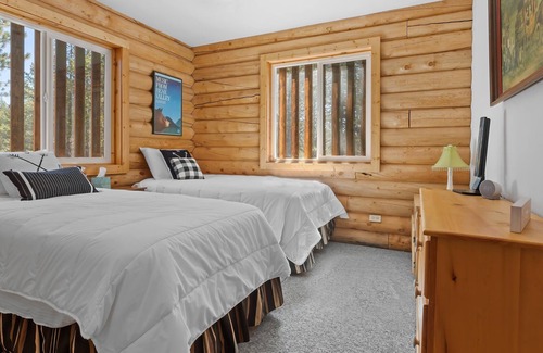 You can't go wrong in this family friendly log cabin off the beaten path. Set amongst the tall pines and amazing Sierra boulders, this home is the definition of mountain living. The floor plan is open and inviting, and great for entertaining. The Kitchen is equipped with everything you need to feed a hungry family. With seating for 6 at the bar/counter in addition to room for 6 around the oak dining table, this cabin is ready for the entire family! On the main floor there are two bedrooms and a bathroom. Bedroom one has a Queen Bed and Bedroom two has two Twin Beds. Upstairs the loft has lots of room to spread out for the kids with a TV, games and 2 sets of Bunk Beds. Off of the Loft upstairs, French doors open into a very spacious Master Suite with a King Size Bed, a sitting area on one side and a daybed on the other. The ensuite Master Bath has a beautiful Bear Claw Tub for relaxing after a long day. This log home is the cabin you will want to come back to again and again.
