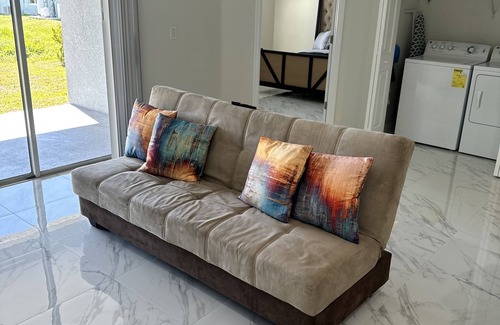 Discover this tremendous 3-bedroom gem in Lehigh Acres. This lovely newly built villa offers a pleasant stay for guests seeking a relaxing getaway. With 1 queen bed, 1 full bed and 1 futon, it comfortably accommodates a group of friends or a small family. it also has a 1 car garage that you can park in with a spacious driveway that holds up to 4-6 extra vehicles. The villa features modern amenities like AC, a washer and dryer, WiFi, an iron, and heating. The 2 bathrooms are equipped with showers and bathtub for your convenience. Immerse yourself in the tranquil atmosphere of this charming property, where you can unwind and create lasting memories. We look forward to welcoming you to our villa.