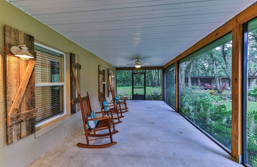 Spend afternoons around this pristine yard! Gather around the porch table overlooking a manicured oasis lush in ferns and palms, shaded by ancient live oak trees that canopy the yard! This Jack and Jill home is ideal for families looking for relaxation and tranquility. This private farm setting offers a fully equipped kitchen, washer and dryer and private Wi-Fi and can sleep 6.
