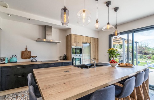 The house welcomes you in a quiet location in the heart of the Luberon Nature Park. Here you can relax to your heart's content in a homely setting, friendly colors, appealing modern furniture and floor-to-ceiling windows, which allow beautiful views in the living area, make up the charm of this charming vacation home. After active days in nature, swing the wooden spoon together in the kitchen and dine with a view of the forest.