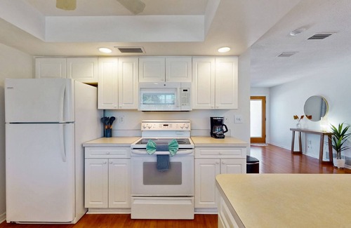 Inside, the cozy living room invites you to unwind with a Roku TV in Guest Mode, allowing you to securely bring your Netflix and other streaming accounts with you. The fully equipped kitchen offers everything you need—fridge, oven, microwave, and dishwasher—whether you're cooking a full meal or just enjoying some takeout from one of Sarasota’s amazing local restaurants.