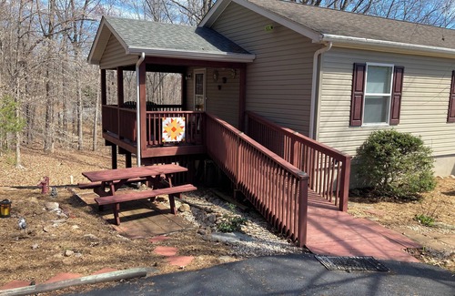 Classic simplicity is found at this sweet 3 bedroom, 2 bath home in a lake community. Enjoy the peace and quiet sitting on the covered porch with an outdoor area for grilling or picnicking. Kitchen is fully equipped. Home has a wheelchair ramp and the master bathroom's shower is handicap friendly. Wifi, TV, washer/dryer, A/C, driveway parking. Fifteen minutes to SML State Park, where visitors can hike, swim, boat. Bridgewater Plaza is twelve minutes away with shops, restaurants, and boat rentals. This property is just minutes from two wineries for wine tasting as well. Two golf courses are nearby that are open to the public. A disc golf course is located in the local Moneta Park, which also offers trails for walking/hiking. Thirty minutes to Bedford and the D-Day Memorial. Close proximity to Roanoke and Lynchburg.