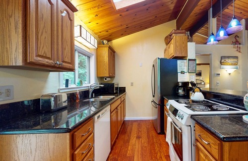 Find a peaceful refuge in the hills of the Northern California Coast at this cozy home. Ocean views, a private hot tub, a charming garden, and a deck surrounded by towering redwoods make this a retreat unlike any other! Inside, vaulted wooden ceilings and a cozy stone hearth offer comfort on rainy days.