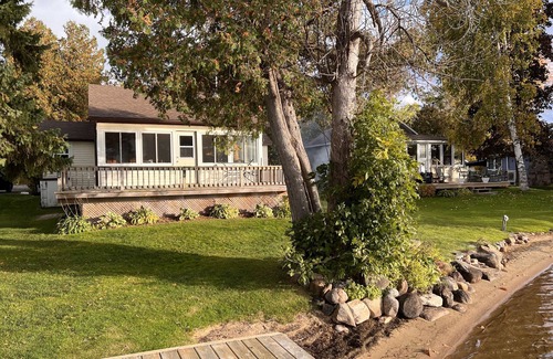 This Ontario cottage rental is located on Cameron Lake, only a 10 min. walk from Fenelon Falls for all your needs. The interior features an open living room with two bedrooms behind, kitchen to the side and a sunroom on the lakeside. The cottage itself is built close to the lake for beautiful views! There is a third bedroom in the upstairs loft with two windows and a fan; the ladder/step is steep and it is permanently placed-see pictures. There is also a king p/o bed in the sunroom. A large deck overlooks the lake and there is also a large deck/dock over the water. The water is a sandy shallow entry and slopes to approx.. 3.5 feet at the end of the dock. At the back of the cottage, across the cottage road is the old railway tracks that have been converted into a walking and biking trail that goes for miles in each direction. You can walk right into town for ice cream!