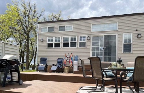 Our cozy park home has everything you need to enjoy your stay at the lake, including a great view of the lake from the living room and kitchen through multiple windows. Park your boat at the dock, sip your morning coffee and evening cocktails on the large patio overlooking the lake, and swim in beautiful Lake Metigoshe at our own little sand beach. This park home has a loft with a queen bed, which comfortably sleeps two, with small TV and little 2-drawer dresser. In the living room area there are full-sized bunk beds with a pull out bed underneath for a total of 3 beds. There is also an 8x12ft shed between the park home and the lake, which can be used seasonally as there is no heat or air conditioning in the shed. The shed has one set of queen-sized bunk beds (currently no mattresses, but can easily use air mattresses). If you get creative, you can sleep 8-9 people. There is a full bathroom with shower (no tub) and washer and dryer. Use the full kitchen to cook meals for all. There is no formal dining room, but there are chairs at the counter in the kitchen and plenty of room on the deck.