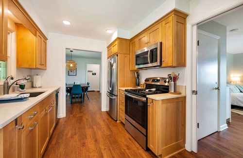 A queen sleeper sofa in the living room accommodates extra guests, allowing the home to sleep up to 8 people.
