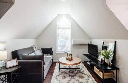 Welcome to our cozy little studio apartment above garage next to the Church of 1906. This recently renovated space is perfect for solo travelers or couples looking for a comfortable and private stay. It also offers additional space for large parties staying in our Church House next door. The apartment features a kitchen, a comfortable queen bed and pull out couch! Taller guests should keep in mind the walls are slanted so you may need to watch your head through the hallway.