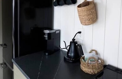 Aspen Haus brings the outside in to create a moody modern sanctuary. This 450 sq ft cabin has a bedroom with a king bed and room darkening blinds, full bathroom with shower, and an open concept living room, dining room and fully stocked kitchen. Large windows in the living room and bedroom look out onto a private deck, hot tub, fire pit, and of course, the tranquil woods of Wilder. A 3 seater sofa pulls out into a queen bed in the living room to accommodate 2 more guests.